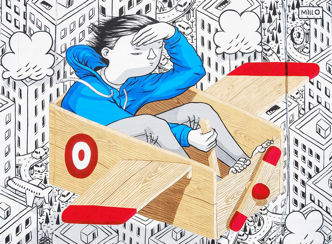 Ma la cosa che amo di più, e che mi fa letteralmente impazzire, è la magia prospettica che ogni murales di Millo propone. Il muro diventa improvvisamente un panorama espresso in assonometria perfetta. Millo si esprime con sapienza simbolica e tecnica.
