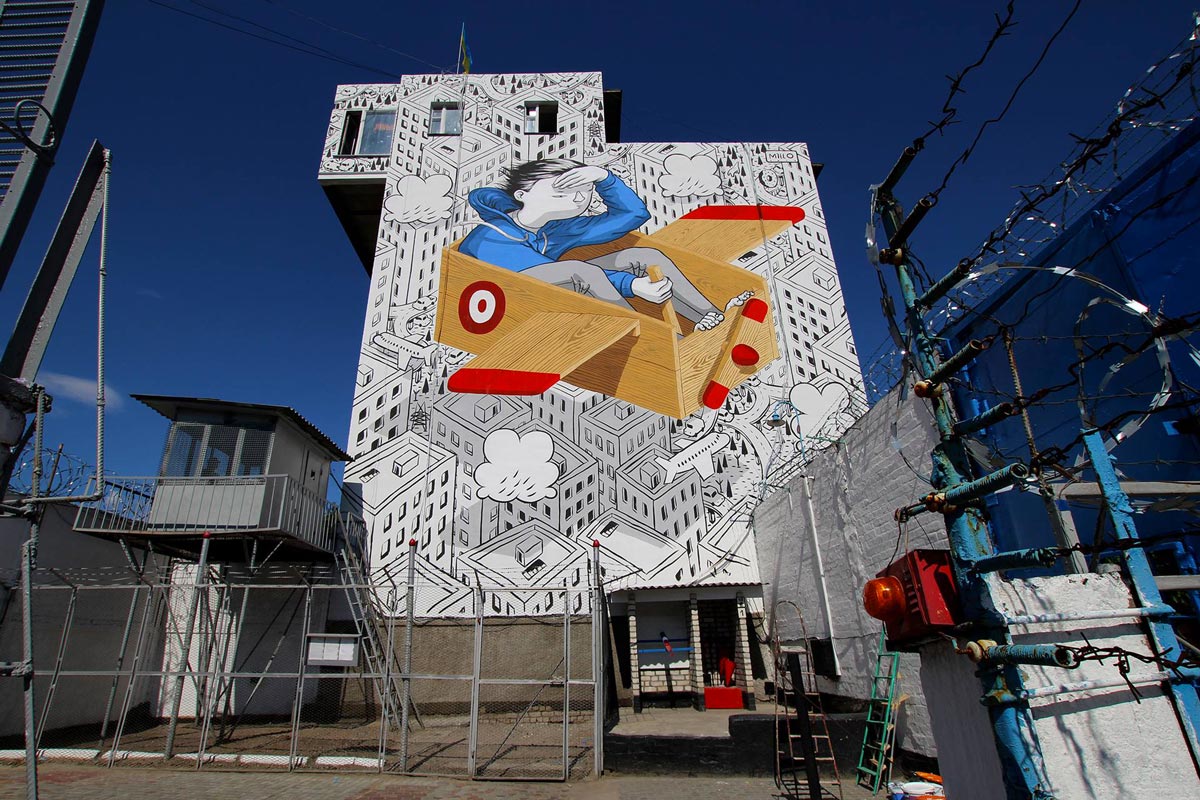 Cosa c’è di più importante che dipingere per dare un messaggio di speranza a ragazzi in riformatorio? Millo dipinge “Il potere dell’immaginazione” proprio su una parete di un penitenziario minorile.