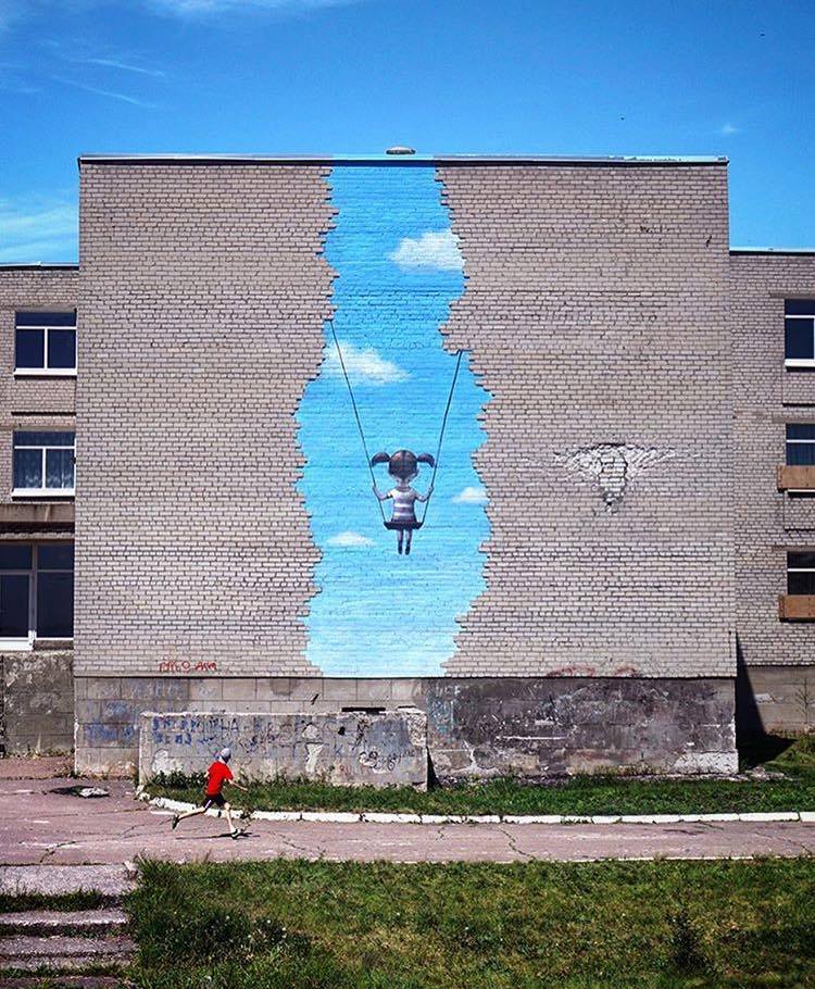 Questo murales, chiamato “Popasna swing” (io l’ho tradotto liberamente l’altalena di Popasna) è stato concluso qualche giorno fa, e sorge nella città di Popasna, in Ukraina, dove c’è una scuola.