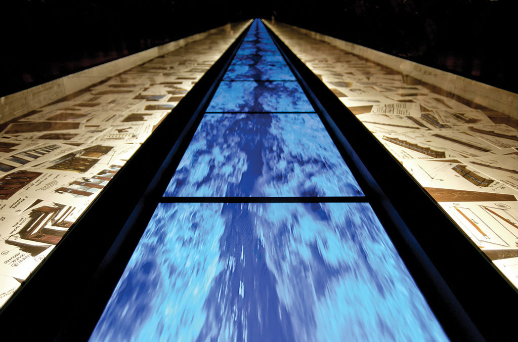 La prima opera che incontrai, toccai, era Waterfire. All’interno di moduli squadrati costruiti con ferro arrugginito, erano inseriti rami di legno naturale e monitor che, in diversi momenti della giornata, proiettavano video (con relativo effetto sonoro) di acqua che scorre blu zaffiro e fuoco crepitante.