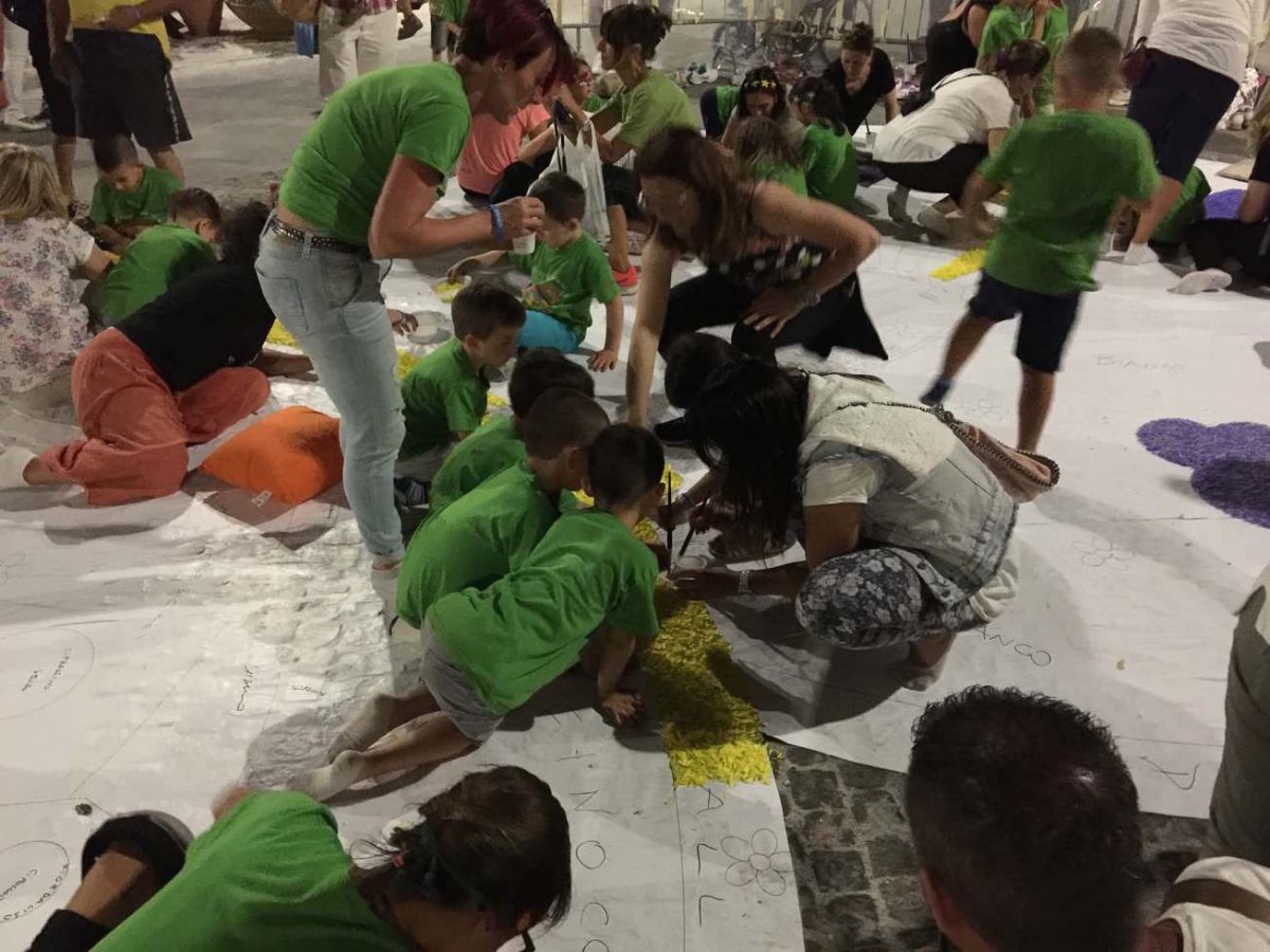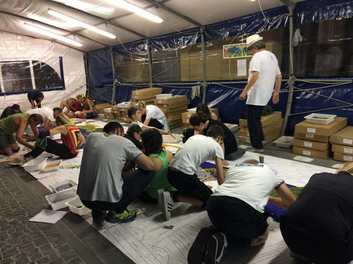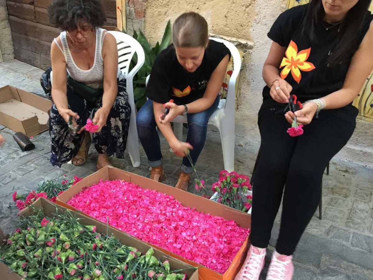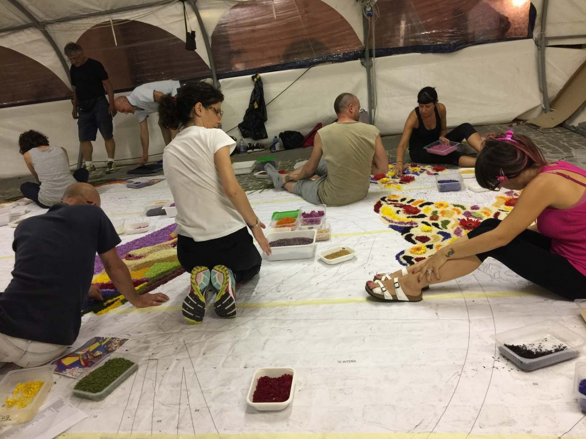 Ogni infiorata è realizzata a un gruppo di infioratori con nome e identità specifica. Non si può descrivere l’entusiasmo, la fatica, la magica collaborazione che vige in ogni gruppo mentre si preparano i petali e si dispongono sul disegno.