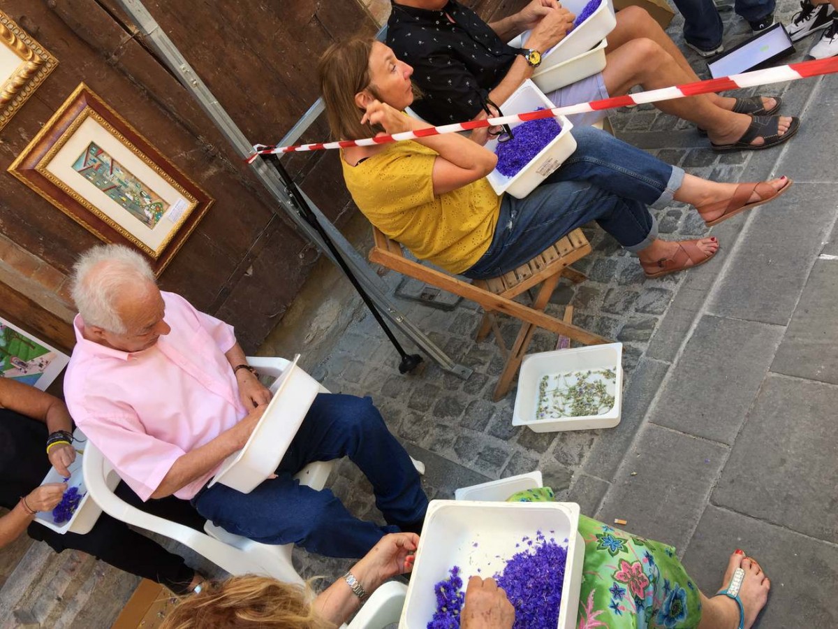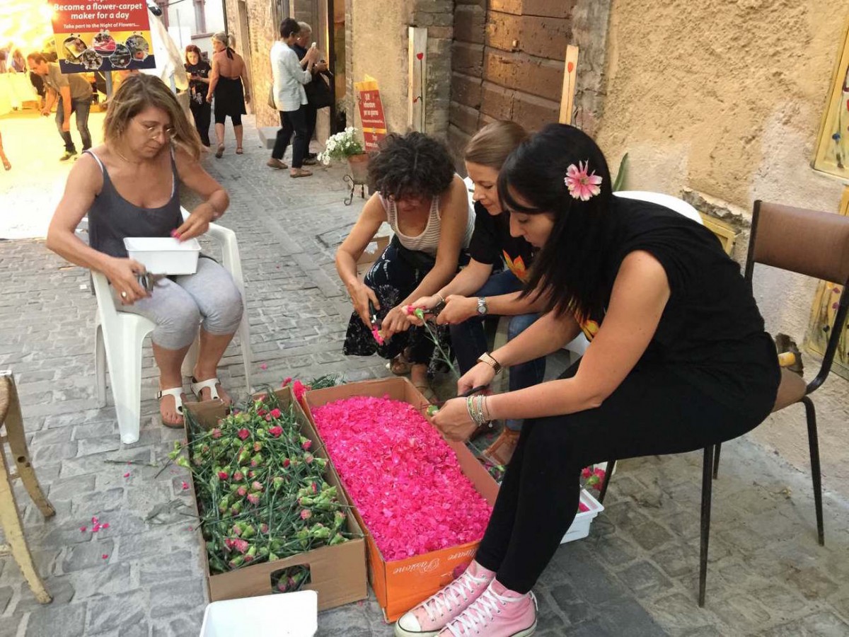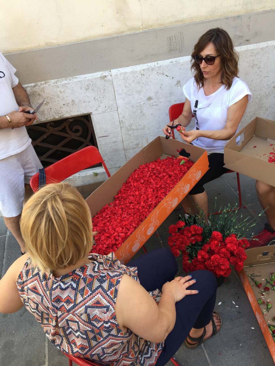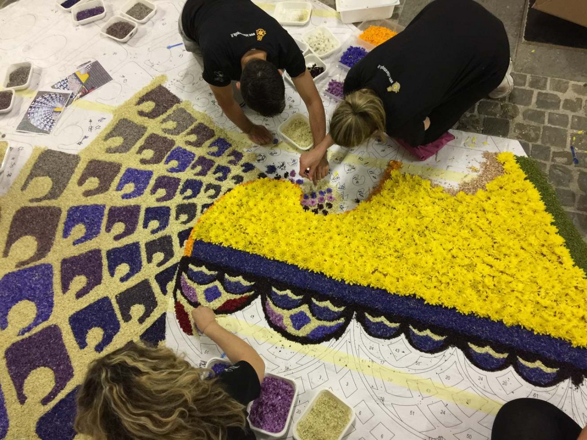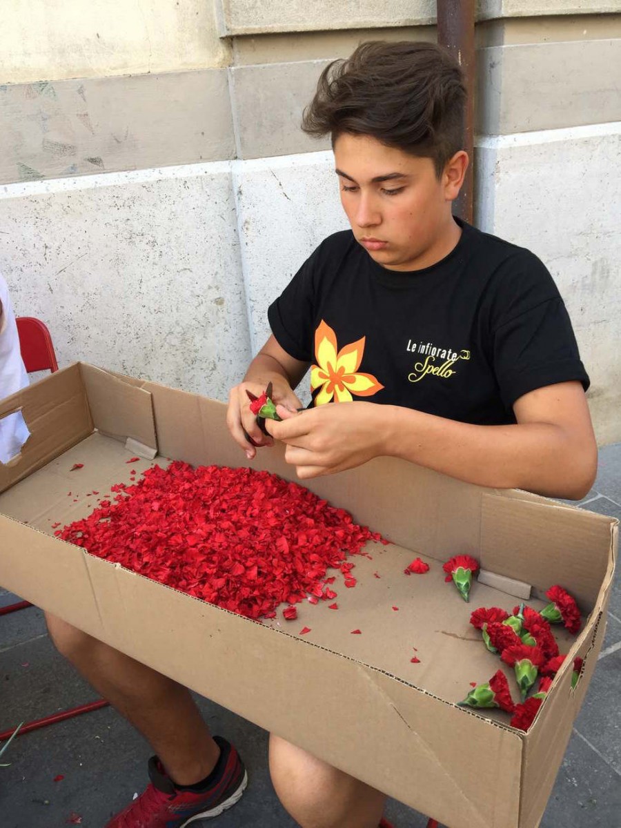 Ogni infiorata è realizzata a un gruppo di infioratori con nome e identità specifica. Non si può descrivere l’entusiasmo, la fatica, la magica collaborazione che vige in ogni gruppo mentre si preparano i petali e si dispongono sul disegno.