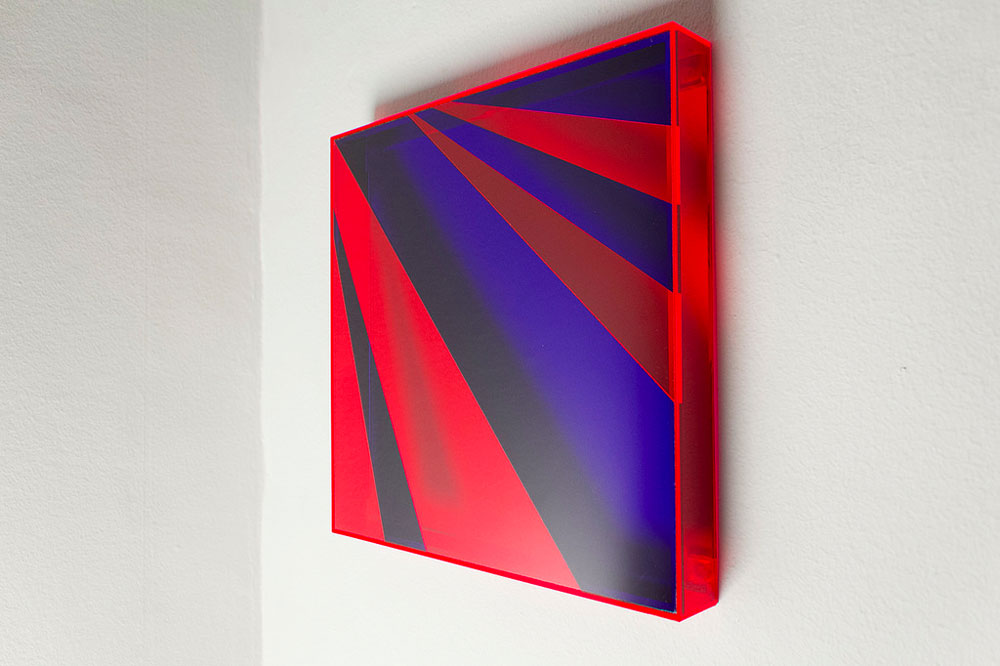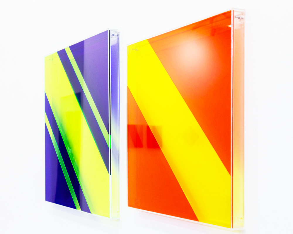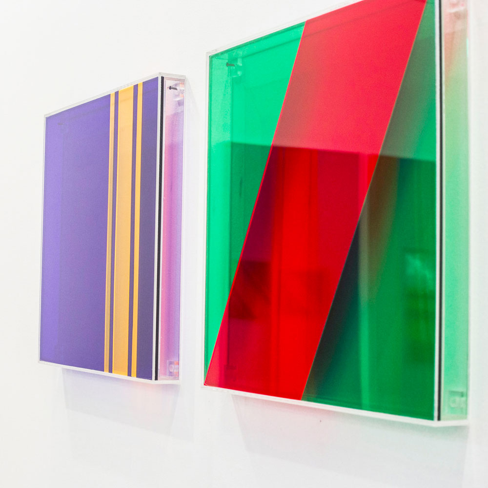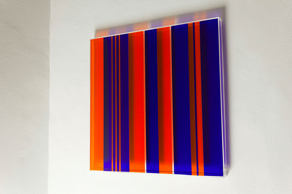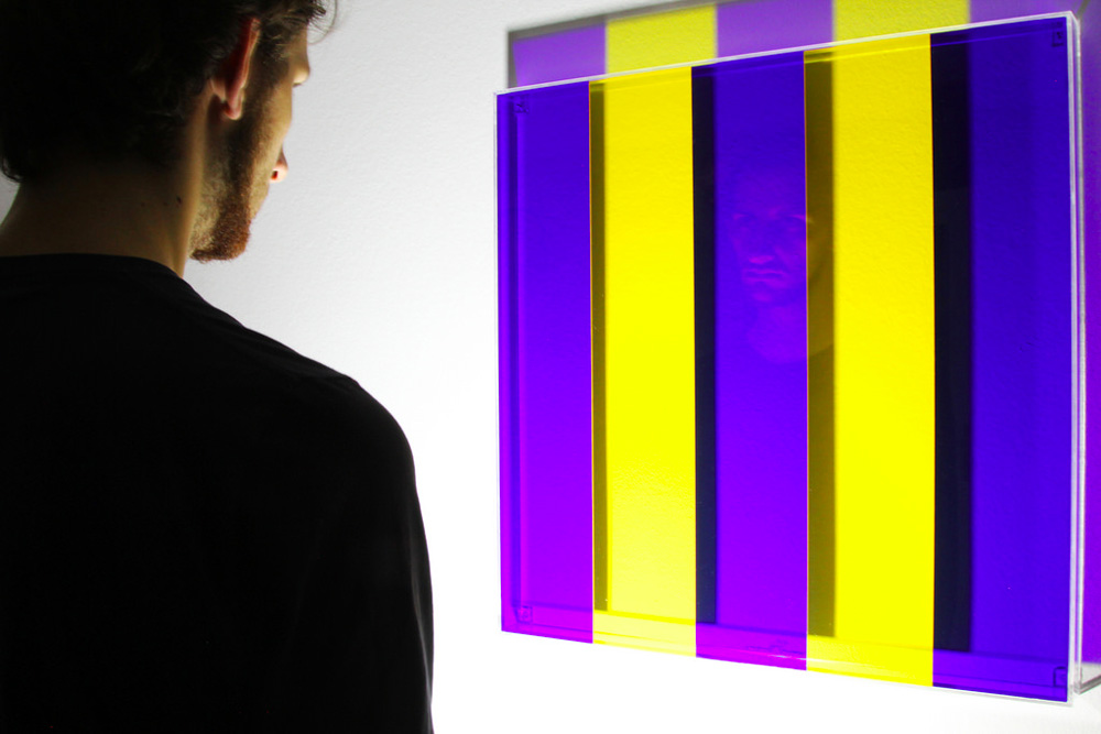Leonardo mi piace tantissimo perchè adotta un linguaggio fortemente singolare. Egli sceglie la “trasparenza” come mezzo di comunicazione. Lavora con i colori e dettagli all’interno e all’esterno delle lastre di metacrilato sovrapposte. Una forte componente legata all’ opera è la luce.